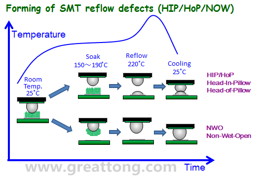 上圖將NWO(Non-Wet-Open)與HIP(Head-In-Pillow)或HoP(Head-of-Pillow)在SMT的Reflow溫度曲線下形成的原因稍微做了解釋,基本上兩者都是因?yàn)榘宀淖冃嗡拢皇荋IP的錫膏會保留在電路板的焊墊上,但NWO則完全轉(zhuǎn)移到了錫球。